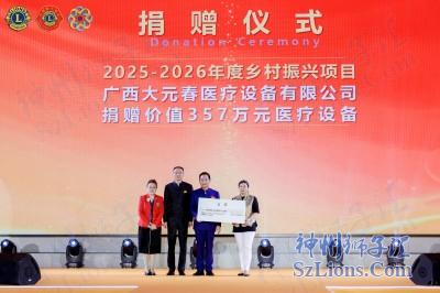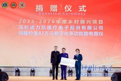 广西大元春医疗设备有限公司向深圳狮子会捐赠价值357万元的医疗设备、深圳德力凯医疗电子股份有限公司向深圳狮子会捐赠价值42万元的数字化多功能脑电图仪,全部用于乡村振兴项目,谭飞会长、赵辉第一副会长接受捐赠。